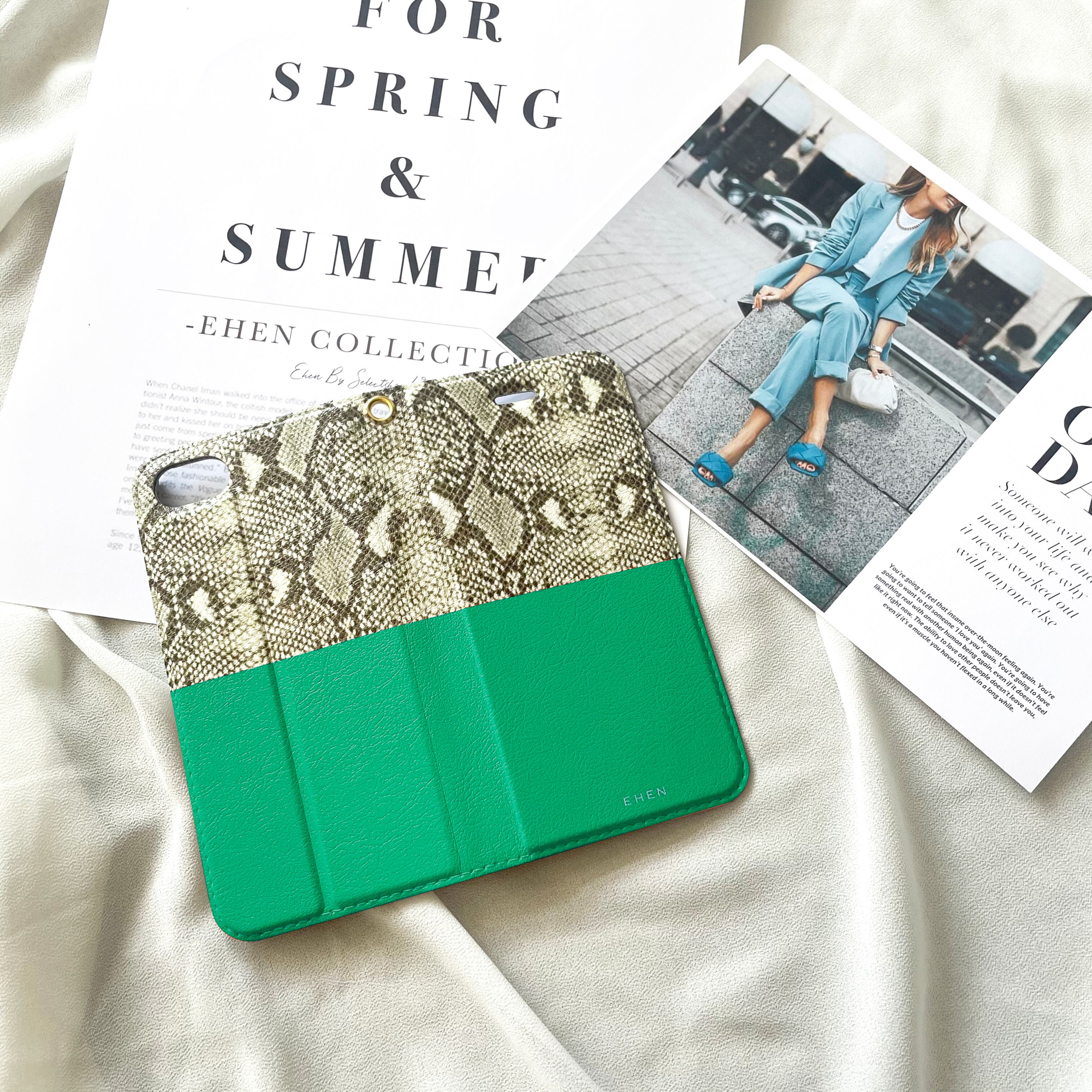 2022SS■ベルトなし手帳型スマホケース/パイソン柄/ビタミンカラー/グリーン[スタンド機能あり][EHEN]